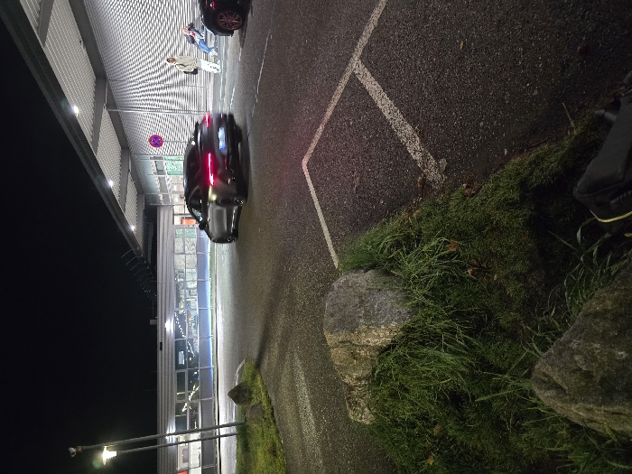 A dark-colored vehicle with illuminated taillights is positioned on an asphalt surface, likely a road or parking area. A building with multiple windowed panels is visible in the background, illuminated by internal lights. A few people are standing near the entrance of the building. A patch of green vegetation, with rocks intermixed, occupies the lower right portion of the image. Road markings are visible on the asphalt. A streetlight is seen at the bottom edge of the scene.