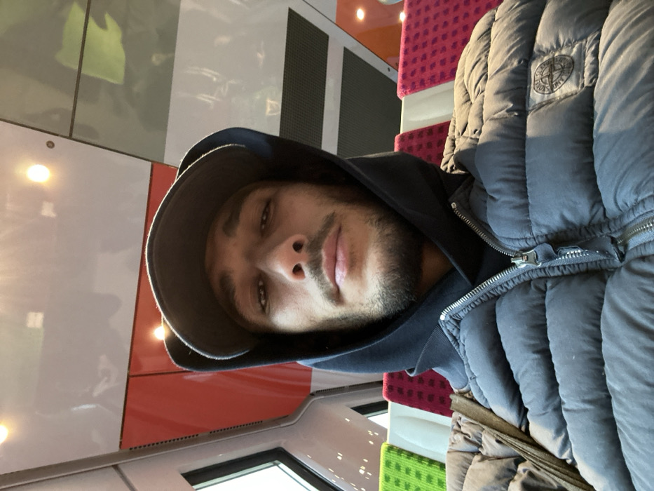 An image depicts a male individual taking a selfie inside a modern passenger train, likely in the city of Bois-Colombes, France. The subject, a man estimated to be between 20 and 35 years old with dark hair and a beard, looks directly into the camera with a neutral expression. He is wearing a dark baseball cap, a dark hooded sweatshirt with the hood pulled over the cap, and a charcoal grey puffer jacket. A circular patch logo, identified as the Stone Island compass, is visible on the upper left sleeve of his jacket. A dark strap from a bag is seen over his right shoulder. The train's interior features light-colored, possibly reflective, ceiling panels with embedded warm-toned circular light fixtures. Seating in the background exhibits vibrant patterned upholstery in alternating green and magenta/red squares. A window on the left side of the frame shows a blurred exterior, and reddish-orange wall paneling is visible on the right.