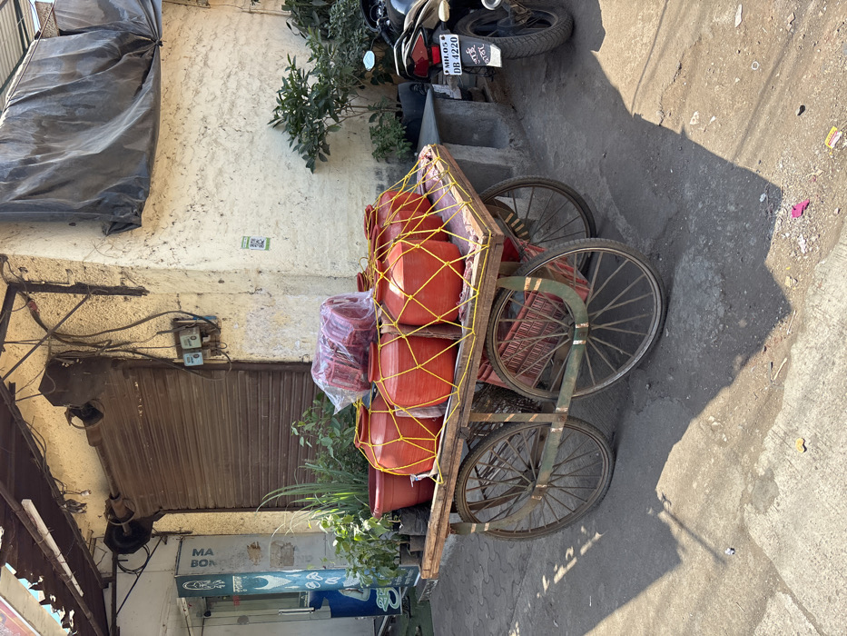 The image depicts a static street scene in Ulhasnagar, India, characterized by a loaded handcart parked on an uneven concrete and dirt surface under bright daylight