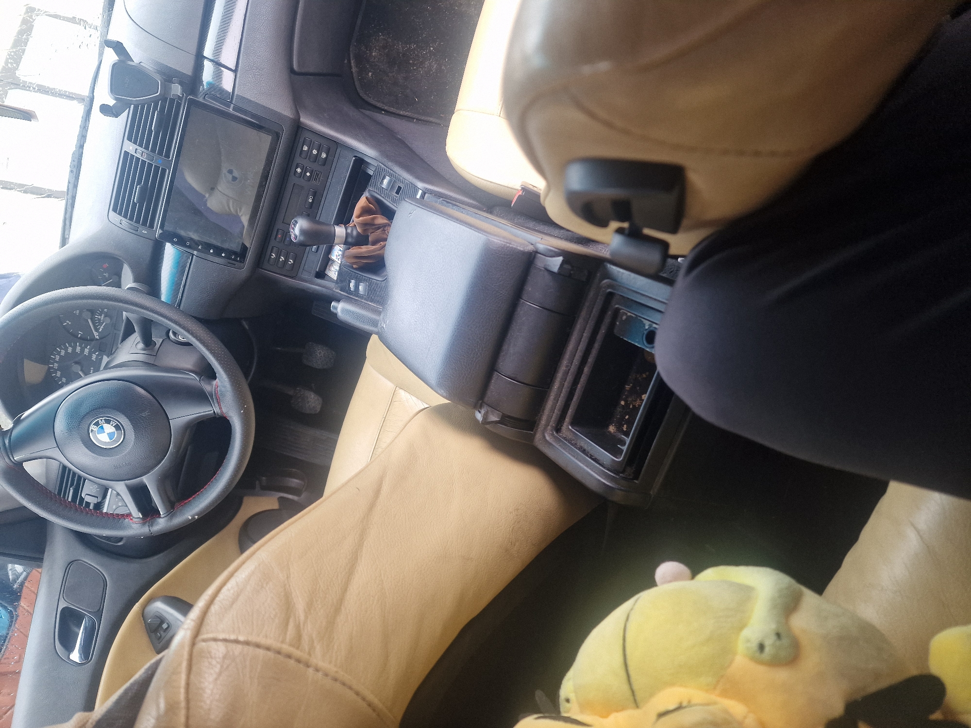 interior of a car, specifically the driver's side. Key elements include a BMW steering wheel, a dashboard with air vents and a display screen, a center console with gear stick, and tan leather seats. A plush yellow toy is also visible on the passenger seat. The exact location in Bogomilovo, Bulgaria cannot be identified based solely on the image.