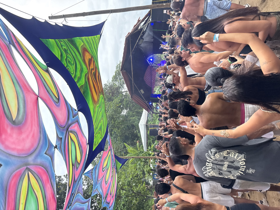 This image depicts an outdoor festival or event in Cairu, Brazil, under an overcast sky. Overhead, multiple large, abstractly patterned fabric canopies in vibrant shades of pink, blue, green, yellow, and orange are suspended, with some sections featuring solid dark blue fabric. In the mid-ground, a makeshift stage with a dark, gabled roof is prominent, displaying blue artificial lighting and speakers on its sides. To the left of the stage, a smaller white square canopy tent is visible. The background consists of dense green tropical foliage. The foreground and mid-ground are densely populated by a crowd of approximately 50-100 individuals, predominantly young adults. Most attendees are facing the stage, with many raising their hands, indicative of dancing or cheering. Attire is casual, including shirtless men, t-shirts, tank tops, and shorts. Several individuals wear event wristbands. A person in the central foreground is seen from behind wearing a dark grey t-shirt with a white "Angeles USA" graphic. Another individual in the right foreground has a spiral-design gold-toned armlet. The ground beneath the crowd is unpaved dirt.