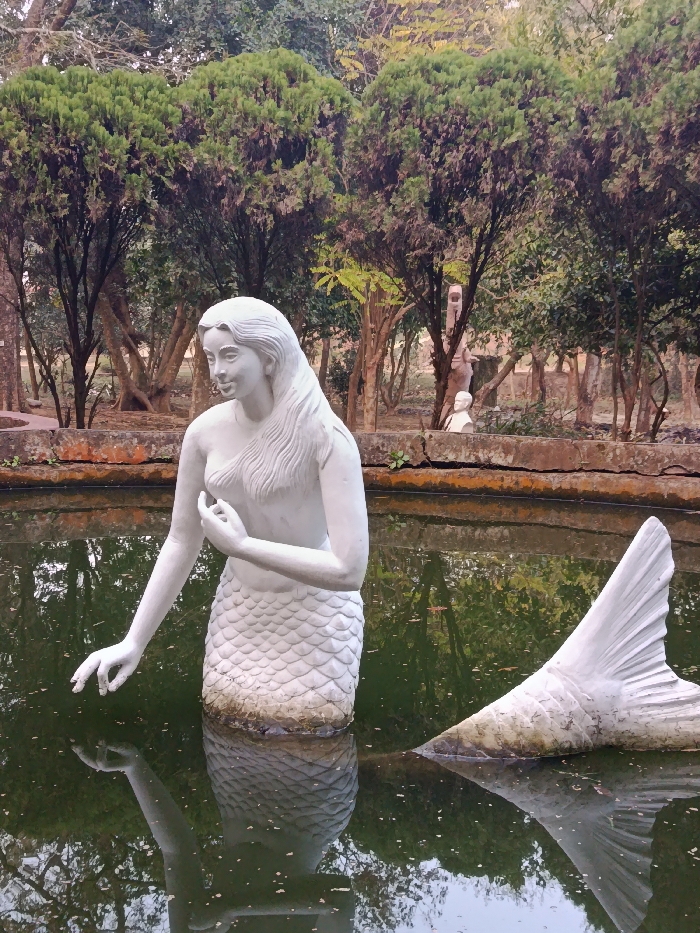 The image depicts an outdoor park or garden scene in Unknown, Bangladesh, featuring multiple white statues. In the foreground, a light-colored, full-torso mermaid statue emerges from a dark green, stagnant pond. The mermaid has long, sculpted hair, her left hand resting near her chest, and her right hand extended downwards towards the water. The lower portion of her scaled, fish-like tail is submerged. To the right of the mermaid statue, a separate white, scaled mermaid tail statue is partially submerged in the pond, its fin clearly visible above the water. The pond has a reddish-brown, weathered concrete or stone edge, showing some discoloration. The water reflects the surrounding trees and parts of the statues. In the background, a dense arrangement of trees with varied foliage is visible, some exhibiting dark green, compact leaves, while others have lighter green leaves and visible trunks. Further back, within the trees, a white bust statue on a pedestal is discernable, along with another taller, abstract white sculpture. The scene is illuminated by ambient daylight.