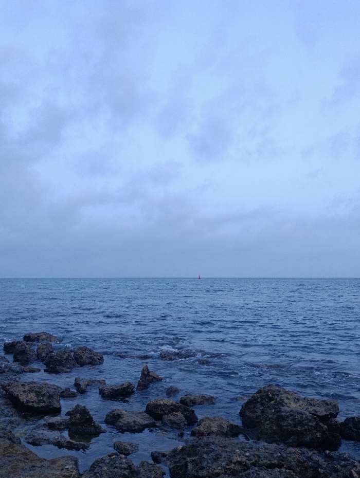 The image displays a static coastal scene at the city of Unknown, Unknown, under an overcast sky. The upper approximately two-fifths of the frame consists of a pale blue-grey sky filled with diffuse, indistinct cloud cover. A clear, straight horizon line separates the sky from the dark blue-grey sea. Centered horizontally on the water, in the mid-distance, a small red navigational buoy is visible. The foreground, occupying the lower two-fifths of the image, comprises a rocky shoreline. Numerous dark, irregularly shaped rocks are partially submerged in the gently rippling water, with small waves intermittently breaking against their surfaces. No individuals or other active subjects are present. The environment is marine, characterized by the sea and a rocky littoral zone.
