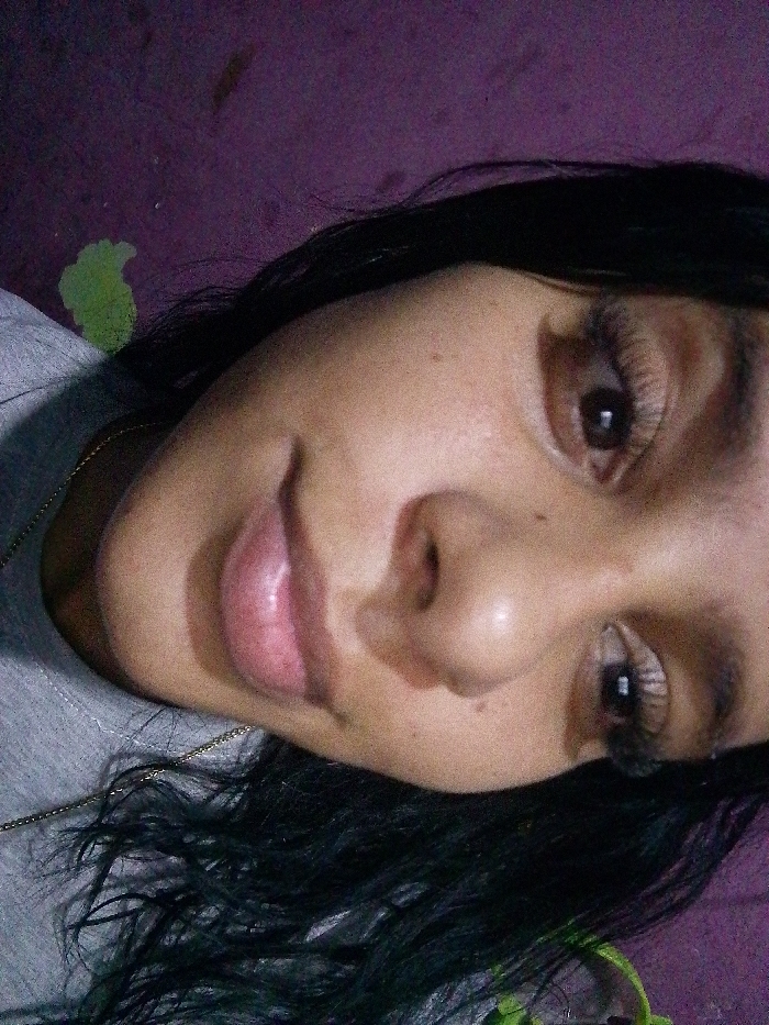 A woman with dark hair is positioned in the center. Her skin is fair, and her lips are full with a pinkish tint. Her eyes are brown with dark lashes. She is wearing a gray top and a gold necklace. The background is a blend of purple and green hues, possibly a surface or backdrop. The image has a slightly blurred or soft focus effect.