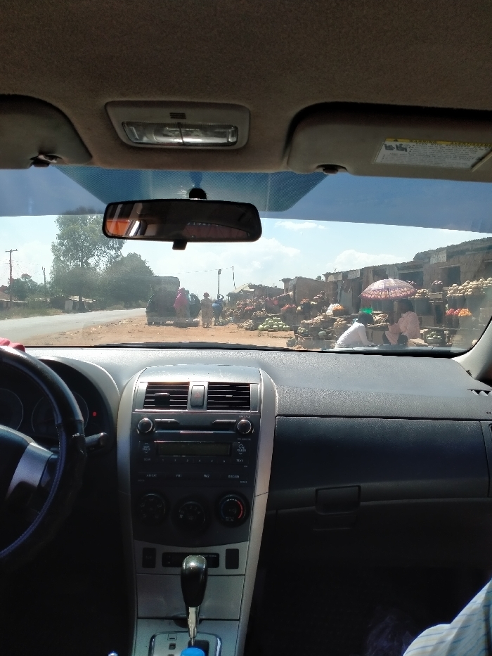 The image captures an exterior scene in Kuru, Nigeria, viewed from the interior of a stationary vehicle