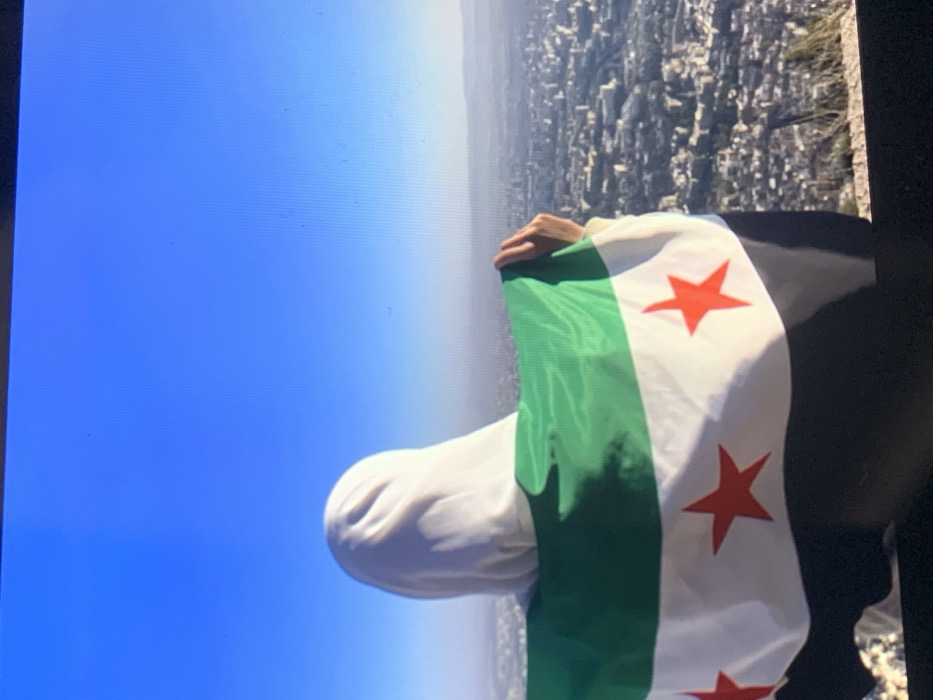 A person stands with the flag of Syria on what appears to be a high balcony, looking out over a cityscape. The sky is blue above. The person is wearing a white hooded sweatshirt. The flag has white and green stripes with red stars. The photo is taken at an angle.