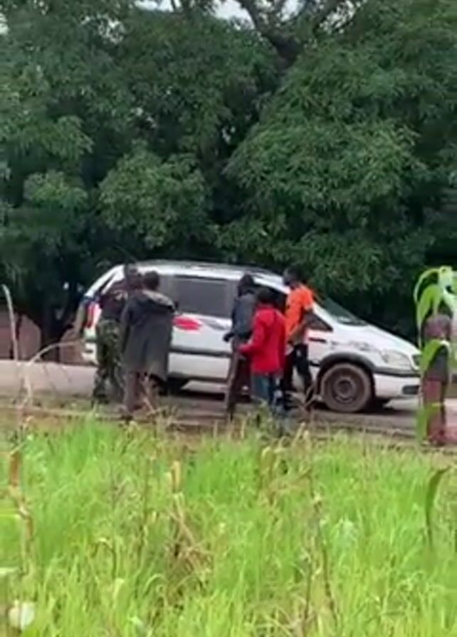 In an outdoor daytime scene, a group of approximately eight individuals gathers beside a white minivan on an asphalt road, bordered by tall, green vegetation on one side and a line of mature trees on the other. One person, clad in camouflage attire and carrying what appears to be a long gun, stands near the driver's side of the van. The rest of the individuals are in civilian clothing and appear to be interacting with the person in camouflage, as well as with one another near the vehicle. The video is shot from a distance, with the foreground being dominated by the green vegetation, slightly obscuring the lower portion of the scene. Overall, the setting suggests a rural or semi-rural area with overcast weather.