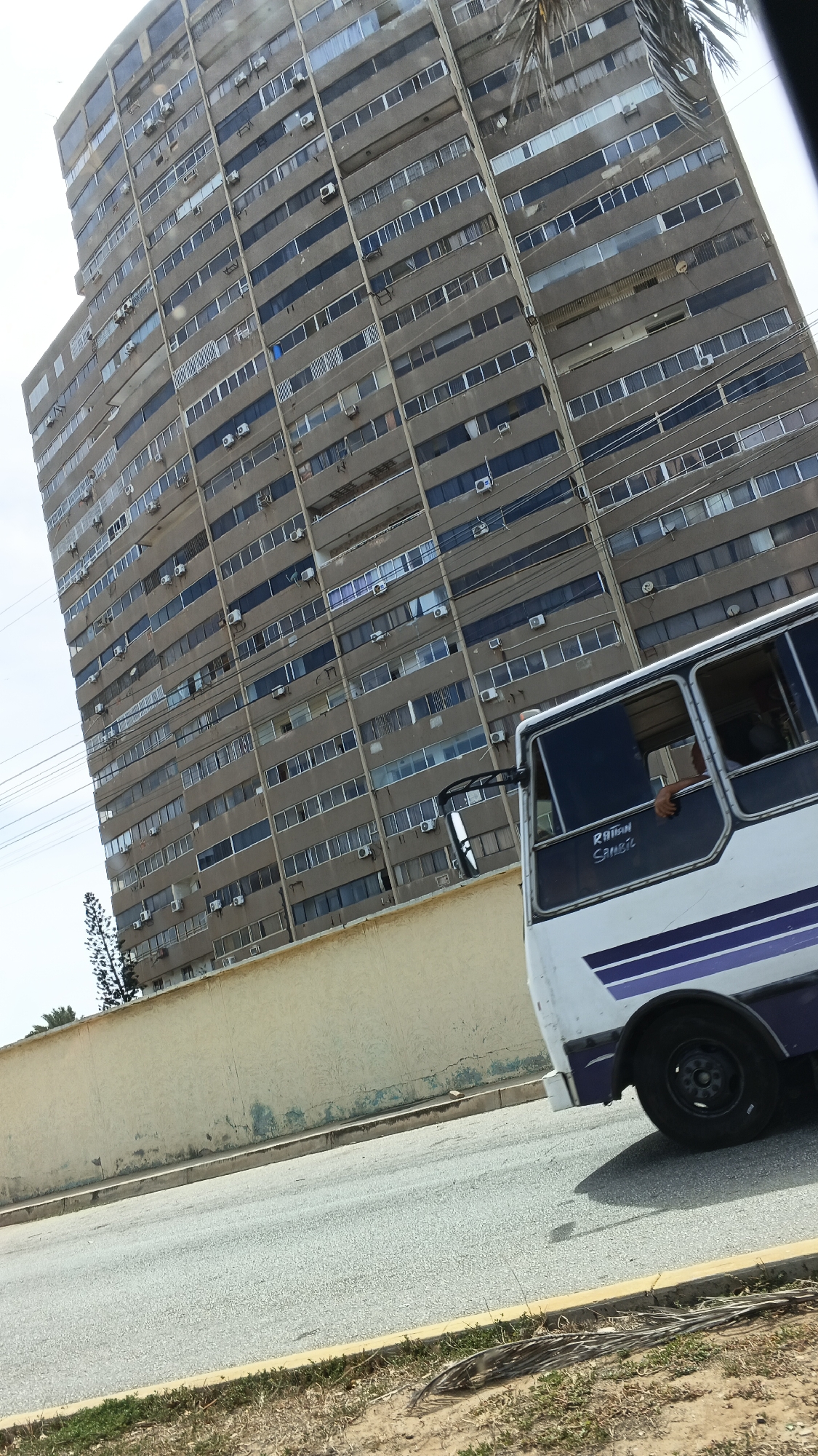 This image depicts an urban scene in Porlamar, Venezuela, viewed from a slightly tilted, low-angle perspective. In the background, a large, multi-story concrete building dominates the left and center, extending out of frame at the top. The building's facade is a weathered, light brown-grey, characterized by numerous horizontally arranged windows, many of which are dark-tinted or reflective, interspersed with visible external air conditioning units. Several power lines span horizontally across the mid-section of the building's face. In the midground, a light beige concrete wall runs parallel to the viewer, exhibiting some greenish-blue discoloration near its top edge. A paved asphalt road, light grey in color, occupies the lower midground, separated from a dirt and sparse grass verge by a yellow curb. On the right side of the frame, a white and purple minibus is partially visible, appearing to be in motion or recently stopped on the road. The vehicle has dark windows, and a person's forearm and hand are extended out of the open driver's side window. Text is visible on the side of the bus below the window, reading "RATON" and "SAMUEL". A dark-colored tire and rim are visible on the bus. Environmental details include sparse green foliage and dry, fallen palm fronds on the foreground verge. A tall, slender coniferous tree is visible behind the wall, to the left. The sky in the upper left is bright and overcast.