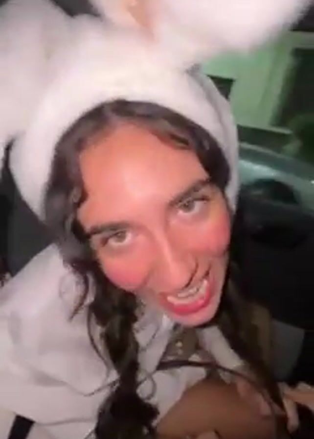 A person wearing white bunny ears and a white hoodie is sitting in the back seat of a car, singing along to a song and dancing