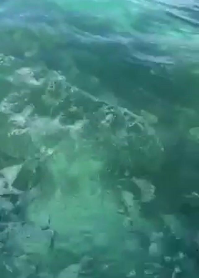 The camera is positioned above a body of water, likely on a boat or dock, as the surface of the water moves gently