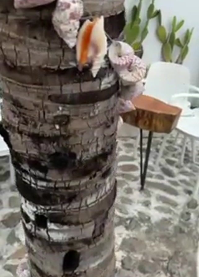 portion of a palm tree trunk, stripped of its leaves, being used as an outdoor decoration. It is strung with a garland of seashells. The seashells are a mix of white and pink, with small holes drilled into them so they can be threaded onto the string. The tree trunk itself is textured with bark and has some dark patches and holes. The ground around the tree is paved with gray and tan stones. In the background, there are white plastic chairs, a small wooden table, and some greenery, including cacti. The overall setting appears to be an outdoor patio or garden.