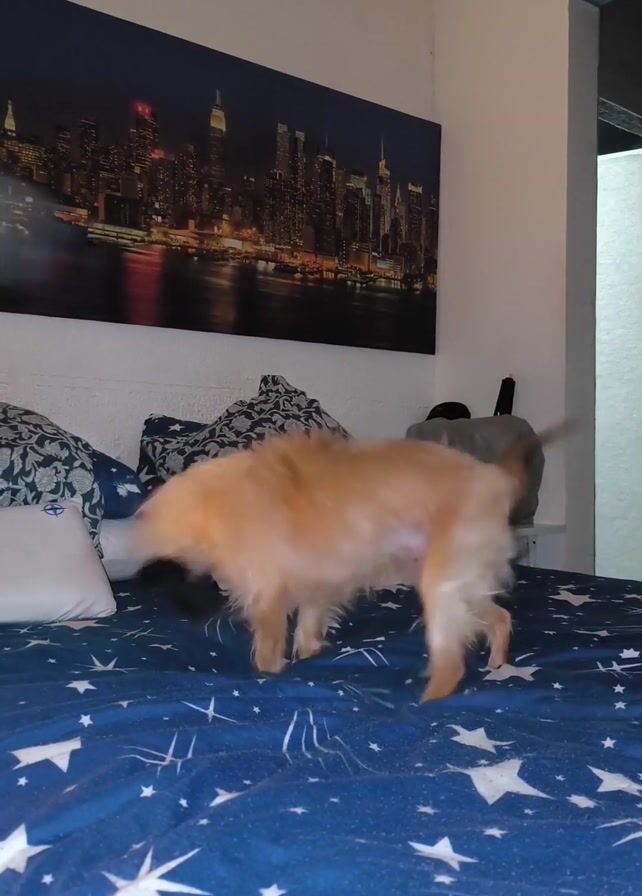 small, light brown dog on a blue bedspread patterned with white stars. The dog is wet or has shaggy fur. Initially, the dog holds a dark-colored object in its mouth, but it drops the object, spins around, and continues to move about the bed. Behind the bed are multiple pillows, a large picture of a city skyline at night, and a partially open doorway.