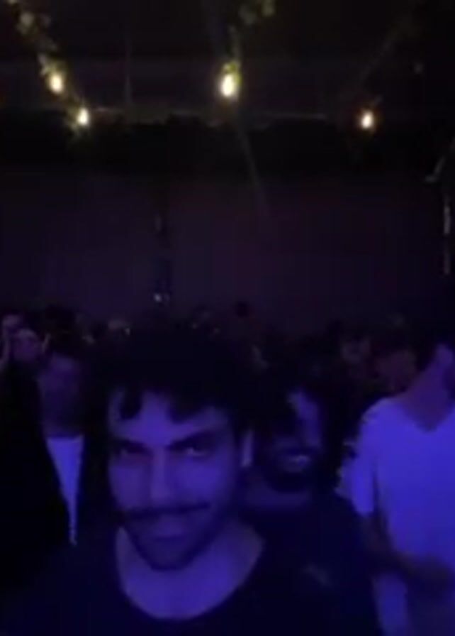 crowded, dark room, possibly a club or bar, with people dancing and socializing. The lighting is dim, mostly illuminated by string lights hanging from the ceiling, casting a blue hue over the scene. The person holding the camera is in the foreground, initially facing the camera, then turning to show the crowd. The people in the room are dressed casually and appear to be enjoying the music. The background is blurry, but it seems like there are some decorations or plants on the walls.
