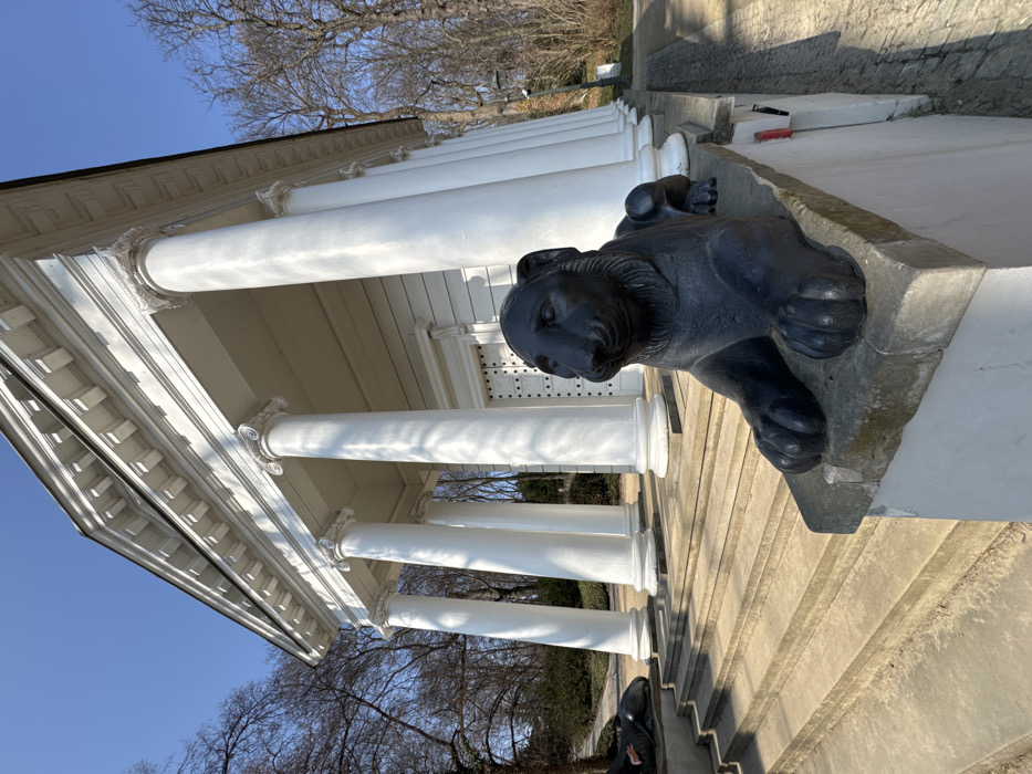 The image depicts the Temple of Diana (also known as the Temple of Sibyl) in Łazienki Park, Warsaw, Poland, on a clear, sunny day. The scene is presented from a low-angle perspective, looking upwards towards the building. In the immediate foreground, on the right, rests a dark, recumbent lion statue on a stone coping. The lion faces slightly to the right, with its front paws extended. To the left, a multi-tiered stone staircase ascends towards the temple. A second, similar dark lion statue is partially visible on the left side of the staircase, further back. The main subject is a neoclassical, single-story temple-like structure constructed from white materials. Its prominent portico features at least six tall, fluted white columns with Ionic capitals, supporting a white entablature and a pediment. The building's walls are white, exhibiting horizontal paneling. Centered beneath the portico is a large, white double door adorned with dark, circular studs. The environment is a park setting, characterized by numerous bare deciduous trees visible on both sides and in the background, suggesting late winter or early spring. A paved pathway runs along the right side of the scene. Bright sunlight illuminates the white architecture, casting distinct shadows on the columns and steps. No people or active interactions are visible.