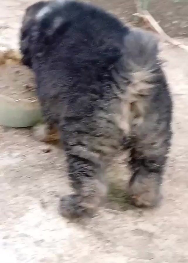 small, fluffy, black and gray puppy. The puppy is standing on a concrete surface near a container with food. The camera is initially focused on the rear of the puppy. The puppy then turns and walks towards the camera. The camera movement is somewhat shaky and blurry. The background includes a wall with some green paint.