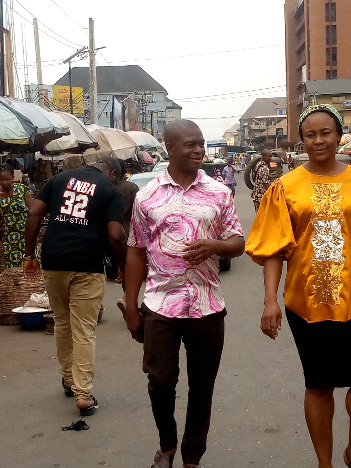 The image depicts a bustling street market scene in Aba, Nigeria, under an overcast sky