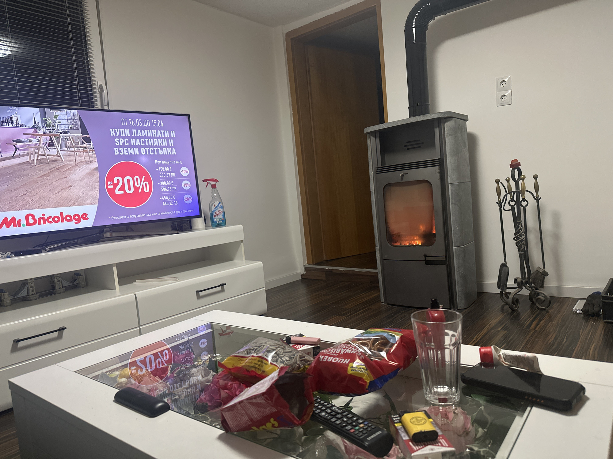 The image captures an indoor living space in Krauchenwies, Germany. In the foreground, a white coffee table with a glass top holds a black Samsung remote control, a black smartphone, an empty clear glass, a pink disposable lighter, a yellow disposable lighter, an opened pack of Marlboro cigarettes, and multiple open snack bags containing items such as sunflower seeds and pretzels. To the left, a large flat-screen television rests on a white entertainment unit with drawers and open shelves. The television displays an advertisement for "Mr. Bricolage" with Cyrillic text, offering a discount on laminate and SPC flooring. A blue spray bottle is positioned on the entertainment unit to the right of the TV. A window with horizontal blinds is visible on the far left. To the right of the scene, a gray, freestanding wood-burning stove with a black flue pipe extending upwards is active, with visible flames behind its glass door. Adjacent to the stove, a decorative black metal stand holds a set of fireplace tools. A double electrical outlet is present on the white wall above and to the right of the stove. A dark wooden door frame leading into another room is visible behind the stove. The room features dark wooden flooring and plain white walls. No individuals are present in the scene.
