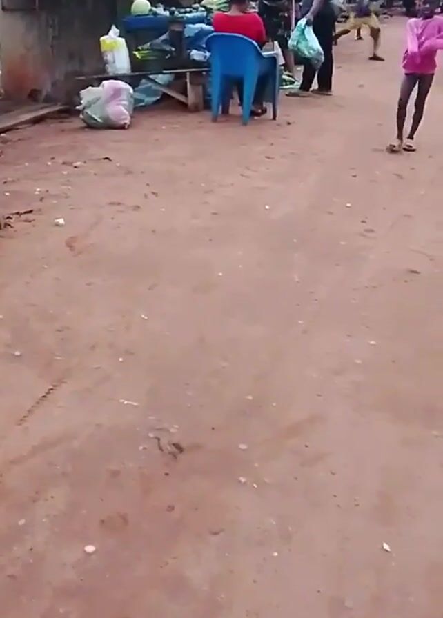 street scene with a reddish-brown, dirt road surface. Several people are present, including one seated in a blue plastic chair wearing a red top. Two men stand nearby, one holding a green bag. A small girl in a pink top and shorts walks toward the camera. There are market stalls on the side of the street, with various items visible, including bags and green produce. The environment appears to be a simple, possibly rural, setting.