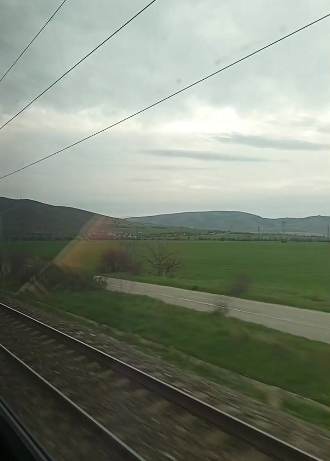 The video depicts a view from a moving train. The camera angle is looking out the side window, showing the passing scenery. The immediate foreground consists of the train tracks, which are blurred due to the motion. Next to the tracks is a strip of green grass, beyond which lies a two-lane road running parallel to the train tracks. Across the road is a large, grassy field, presumably farmland. In the distance, there are rolling hills and a cloudy sky, suggesting an overcast day. The train's overhead electrical wires are visible in the upper portion of the frame. The scene conveys a sense of travel and the rural landscape being traversed.