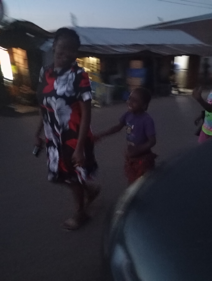 The image displays an outdoor scene at dusk or early night in an undetermined urban environment in Unknown, Unknown. Three individuals are in motion, walking on an unpaved surface. In the center-left, an adult female with dark skin wears a black dress with red and white floral patterns and light-colored sandals. She holds a small, reflective cylindrical object in her right hand and appears to be holding the right hand of a young child walking to her immediate right. This child, also with dark skin, wears a purple short-sleeved t-shirt and dark shorts, and is looking towards the right with an open-mouthed expression. A second child is partially visible on the far right, wearing a multi-colored garment and having an arm raised. The background consists of multiple single-story structures with corrugated metal roofs, some of which show interior illumination through openings. A dark, curved object, suggestive of a vehicle's bodywork, occupies the lower right foreground. The sky overhead is a fading twilight blue-grey.