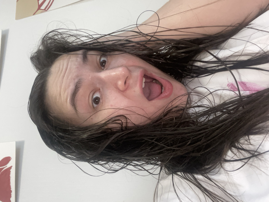 - "A person with long, dark, wet hair is positioned upside down in the frame, wearing a white t-shirt" by FM-igmhG3, licensed under CC BY 4.0