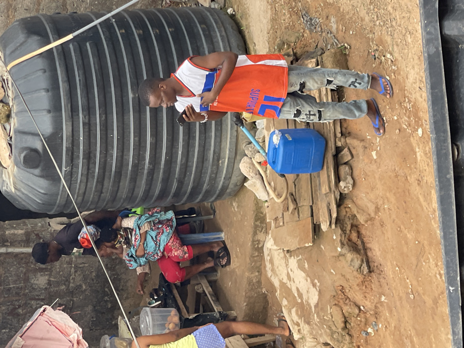 An outdoor scene shows a man in an orange jersey looking at his phone next to a large water tank. A blue container with a hose rests beside him. In the lower left corner, people are seated on a low structure. Another person reclines on the ground. The surroundings appear modest, with a dirt ground and weathered materials.