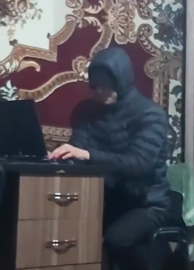 A person wearing a black hooded puffer jacket and pants sits at a small desk with a laptop in front of them. They are seated on a black chair. The person's hands are visible as they type on the laptop. Behind the desk is a patterned wall covering with a maroon and gold design. The desk has three drawers, each with two silver-colored handles. A green towel is draped over the back of the chair. The room appears to be indoors.