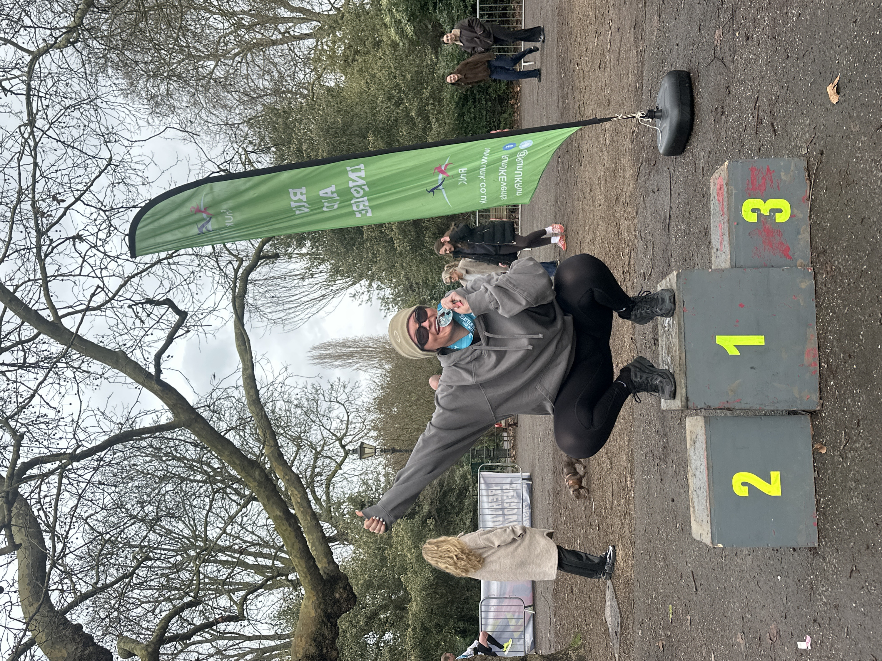 A female individual is captured crouching on the central '1' position of a grey, three-tiered winner's podium, marked with yellow numbers '2', '1', and '3'. She wears a grey hooded sweatshirt, black athletic leggings, black sneakers, a light brown beanie with an Oakley logo, and dark sunglasses. Her left hand is raised in a thumbs-up gesture, while her right hand holds a light blue and silver medal, marked "BATTERSEA PARK MARA", to her mouth. The scene is outdoors in Battersea Park, London, United Kingdom, indicated by details on the medal and event barriers. In the background, a green vertical flag for "RUN AND INSPIRE" and "runuk.co.uk" stands to the right. White metal barriers, some bearing event advertisements including "BATTERSEA PARK MARATHON", delineate the area. The ground is muddy dirt, scattered with leaves. To the left, a woman with long blonde hair, wearing a beige coat, stands facing away from the camera, near a small, short-haired dog with a harness. Further left, a runner's leg in black shorts and neon yellow shoes is visible behind a barrier. To the right, two women walk in the mid-ground. The upper portion of the image is dominated by numerous bare-branched trees under an overcast sky, suggesting a cool season. A black lamppost is also visible in the background.