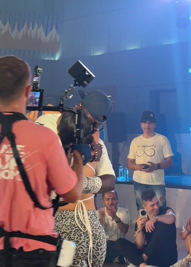 In a brightly lit indoor venue, a man and a woman embrace, surrounded by an audience and filming crew. The man wears a white shirt, dark pants, and a cap, while the woman sports a white top with criss-cross straps and animal print pants. A cameraman, clad in a pink shirt and black shorts, films the scene with a professional camera mounted on a gimbal rig. Additional audience members sit or stand around the central action, some recording with their phones and others clapping. A large screen displays a tropical scene in the background, and stage lights illuminate the space. The room has a high ceiling, and the floor appears to be polished wood.