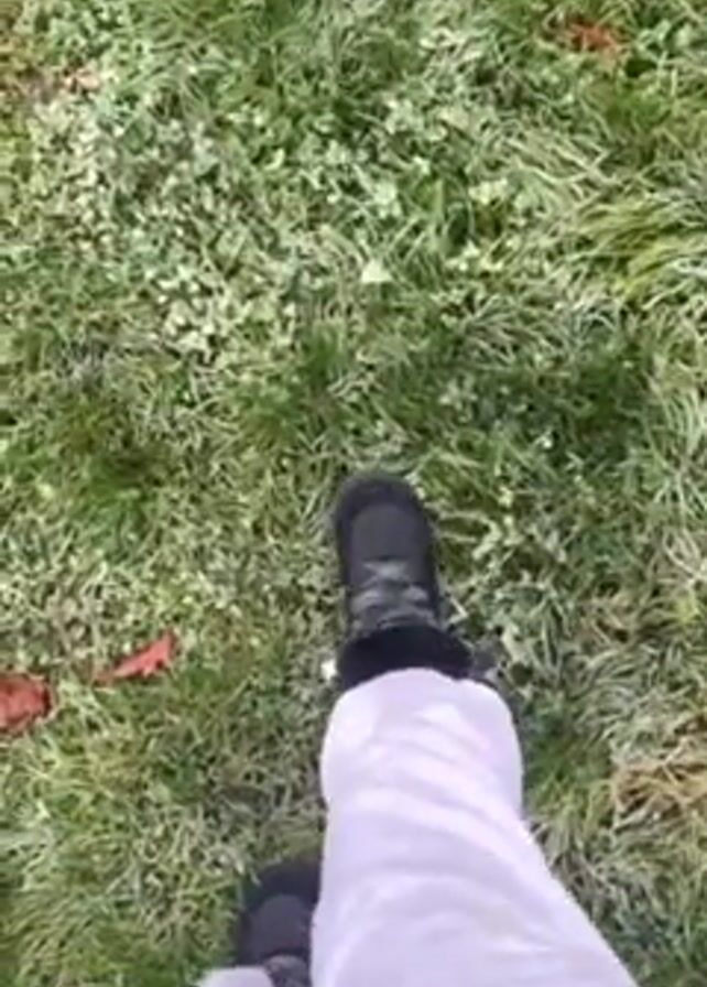 The video begins with a first-person shot of someone walking on grass, then shifts to a wider view of an urban park scene