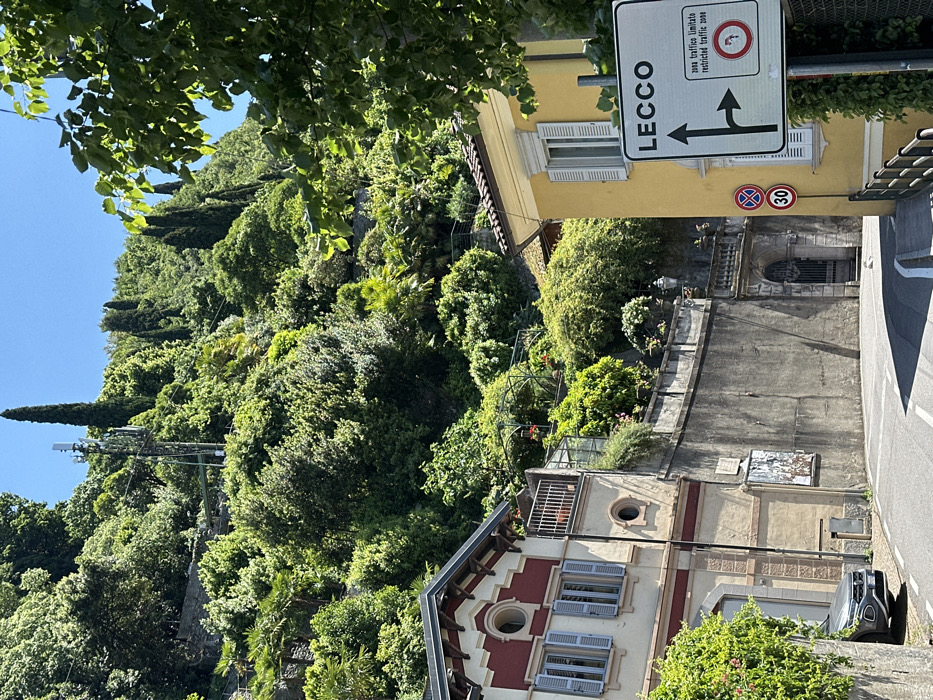 street in Varenna, Italy (latitude: 46.012, longitude: 9.283). The street is narrow and curves to the right. There is a large sign at the end of the street that reads "LECCO." The sign is yellow with black lettering and a black arrow pointing to the right. The sign also has a small sign underneath with the text "zona traffico limitato restricted traffic zone." There is a car parked on the left side of the street, facing the camera. There is a house on the left side of the street, with a red-brick facade and a white trim. The house has a small window and a larger window with blue shutters. The house on the right side of the street has a yellow facade with a white trim. The house has a window with white shutters. There are a number of trees and bushes in the background. The street is paved and there is a low stone wall on the right side of the street. The stone wall has a metal railing on top. The sky is blue and the weather appears sunny.