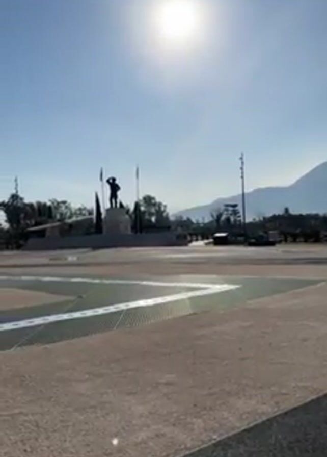 statue of a soldier standing on a pedestal, silhouetted against a bright, sunny sky. The statue is located in a plaza with a patterned ground surface. There are flags flying near the statue. In the background, there are trees and mountains. The camera slowly zooms in towards the statue.