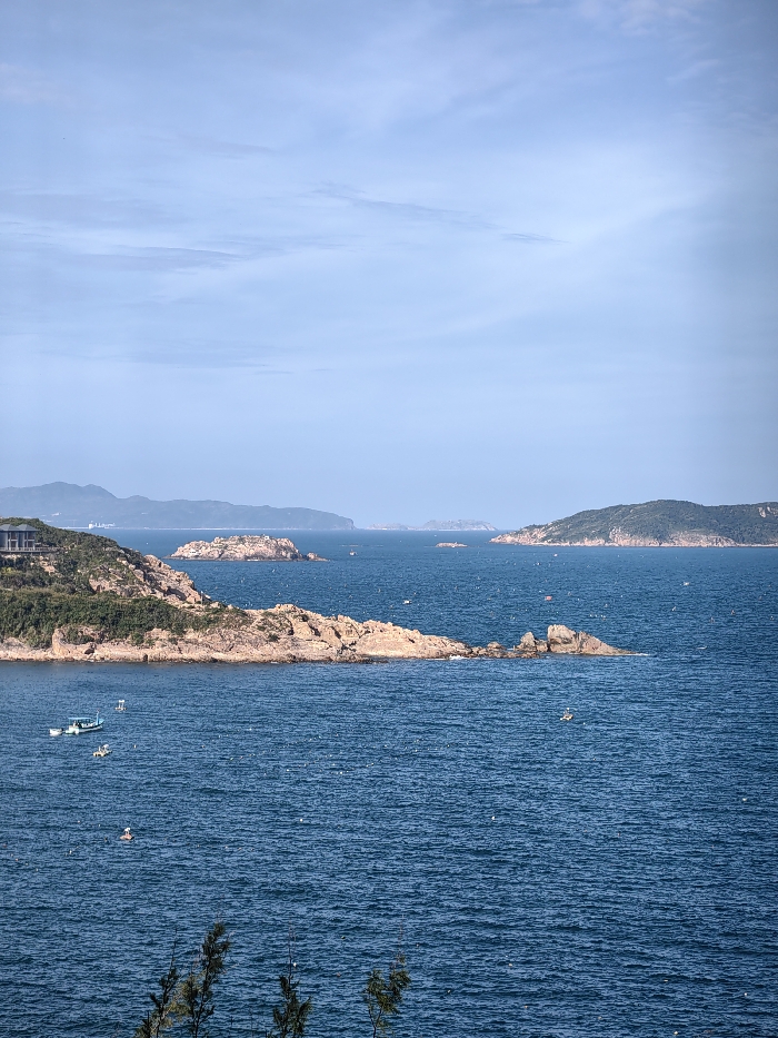 The scene depicts an elevated view of a coastal area in Tuy Phong 4, Vietnam, under a light blue sky with scattered cirrus clouds. The foreground features dark green foliage branches. The dominant element is a deep blue ocean, exhibiting ripples across its surface. On the left, a green, rocky headland juts into the water, supporting a multi-story building with a dark roof partially visible amidst vegetation. Two small vessels are positioned near this headland: a light blue fishing boat with a white cabin, and a smaller white boat adjacent to it. Numerous rocky islets and islands, varying in size and vegetation density, are distributed across the sea, extending toward the horizon. A larger, vegetated island is prominent in the right mid-ground. A solitary small white boat or kayak is situated in the open water to the right. Distant mountain ranges, softened by atmospheric haze, are discernible along the far horizon. Small white specks, consistent with buoys or remote objects, are scattered across the water surface.