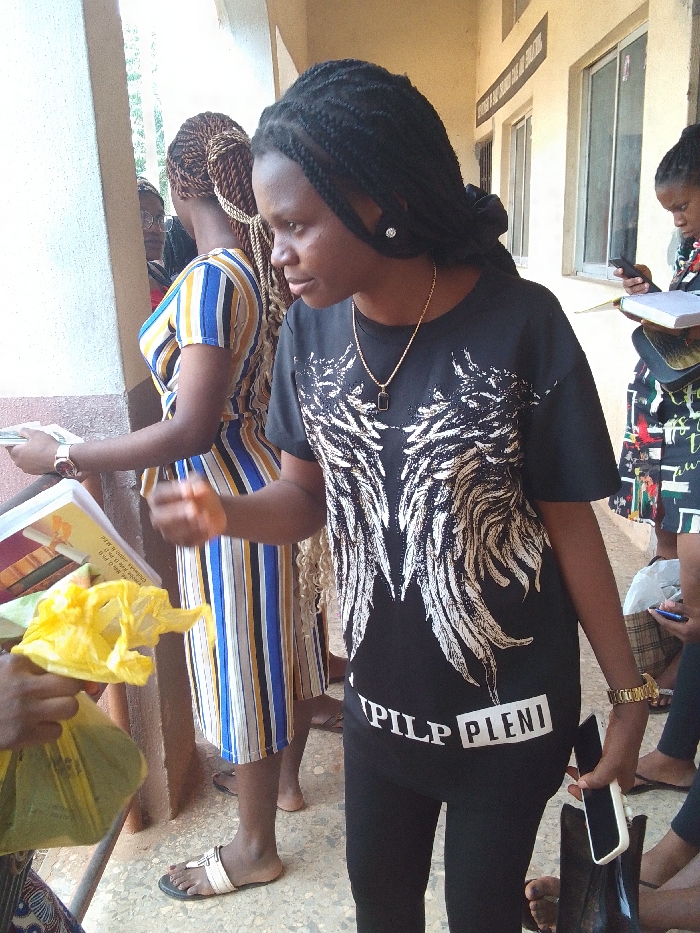 A group of individuals is gathered outdoors, adjacent to a light brown building identified by text on its facade as "FACULTY OF THE SOCIAL SCIENCES BUILDING." This scene is located in Nsugbe, Nigeria. In the foreground, a young Black female stands, facing towards the right. She has long black box braids and wears a black t-shirt with a prominent white winged design on the chest, black leggings, a gold-colored chain with a dark rectangular pendant, and a gold-toned wristwatch on her left wrist. She holds a white smartphone in her left hand, while her right hand is partially obscured, appearing slightly clenched. A small, light-colored stud earring is visible in her left ear. Behind and to her left, a second young Black female is partially visible, wearing a vertically striped midi-dress (blue, yellow, white, and brown) and white flat sandals. She has light brown braided hair and holds several pamphlets or thin books in her left hand. An additional, mostly unseen individual in the bottom left holds a yellow crumpled object, possibly a plastic bag, near the books. Further in the background, other individuals are present. One person to the far left wears glasses and a red top. To the far right, another person is seen holding a smartphone and a book. The environment includes a concrete ground surface and windows on the building.