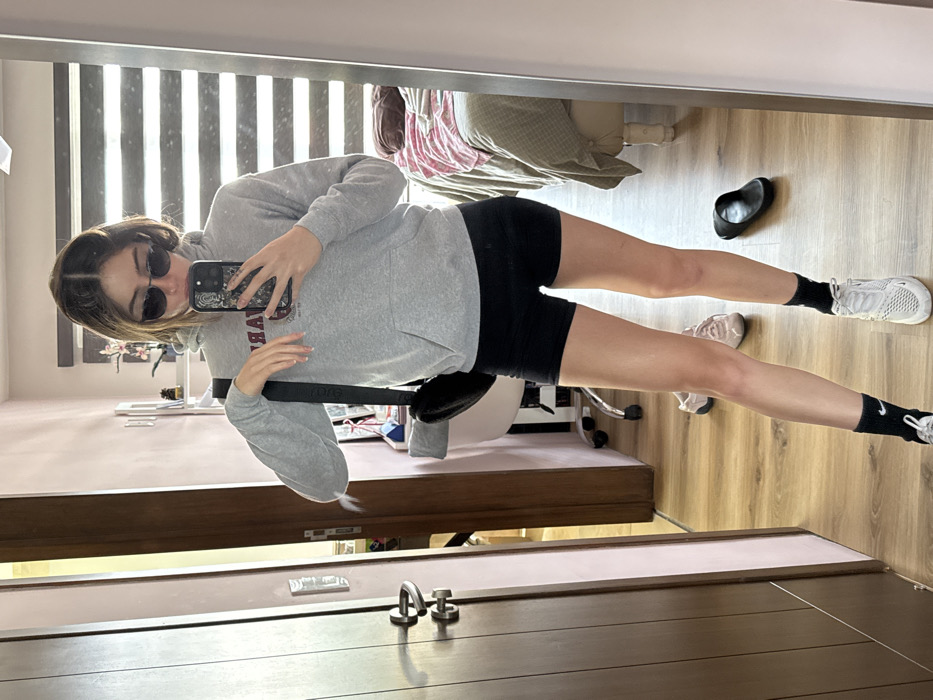 A young woman takes a mirror selfie. She wears a gray hoodie, black shorts, black socks, and white sneakers. Sunglasses rest on her face. A black purse hangs across her torso. The room contains blinds, a bed, a desk, a chair, and discarded shoes. The mirror reflects the room, including a closed wooden door with silver hardware.