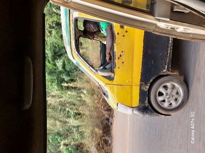 A blurred view from inside a vehicle captures another vehicle with two visible passengers. The yellow and black vehicle appears slightly worn. One passenger wears a green shirt and seems to be at the wheel. The second passenger is partially obscured behind them. The road is visible below the vehicle, along with vegetation on the roadside. Part of the car's interior and door frame from which the picture is taken is in the foreground.