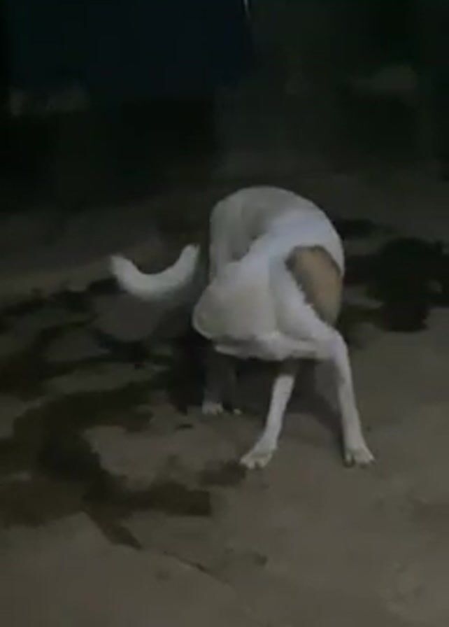 A medium-sized dog with white fur and brown and black markings is shown in a dimly lit outdoor setting. The dog initially has its head turned towards its rear, appearing to lick or groom itself. It then lowers its head to the ground and takes a few steps. The ground appears to be dirt or concrete with some dark, wet spots. Some foliage is visible in the background, and a dark object hangs overhead. The overall lighting is poor, making it difficult to discern fine details.