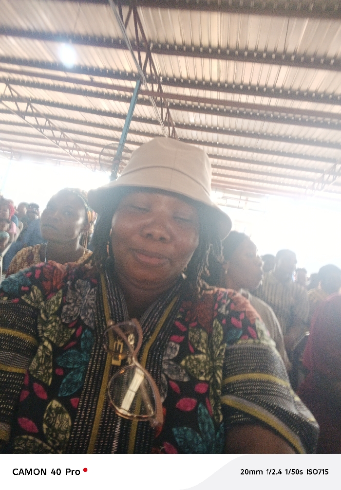 An adult female, appearing to be of African descent, is centrally positioned and in focus, depicted in what appears to be a selfie taken within a crowded indoor or semi-outdoor gathering in Lagos, Nigeria