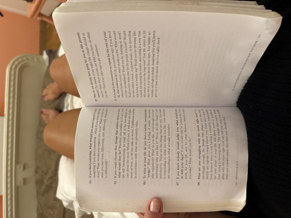 The image depicts an indoor scene in Wattrelos, France, showing a person reading a paperback book while reclined. The visible elements include the reader's lower legs and feet, featuring pink painted toenails, resting on white bedding. A left hand, with a light-colored manicure, holds open a copy of "101 Essays That Will Change the Way You Think" by Brianna Wiest. Pages 336 and 337 are displayed, detailing philosophical questions numbered 04 through 10. The book rests on a dark fabric, with a light-colored, possibly tufted, headboard of a bed visible in the background, along with a partial view of light-toned furniture and a warm-colored wall.