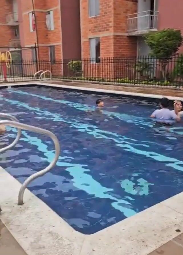 The camera pans across an outdoor swimming pool where several people are swimming. The pool is lined with dark blue tiles that give the illusion of water flowing underneath. The pool is surrounded by a stone-tiled deck. Beyond the pool, there is a black metal fence that separates the pool area from other outdoor spaces. Beyond the fence is a playground and a basketball court where other children are playing. Behind the playground and pool area are rows of tall, multi-story apartment buildings constructed of red brick. The sky above is overcast and gray.
