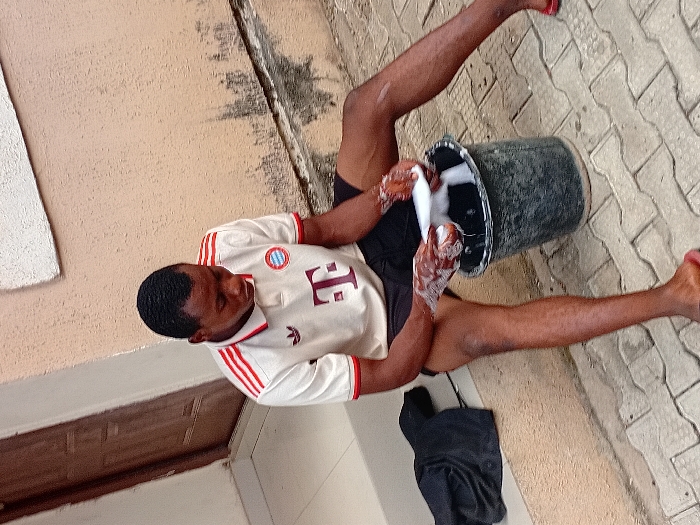 An African man sits on the ground next to a building. He wears a Bayern Munich jersey, black shorts, and red sandals. A black bucket sits between his legs, and he's washing something white inside, creating soapy bubbles. A folded dark cloth rests nearby. The ground is paved with interlocking gray stones.