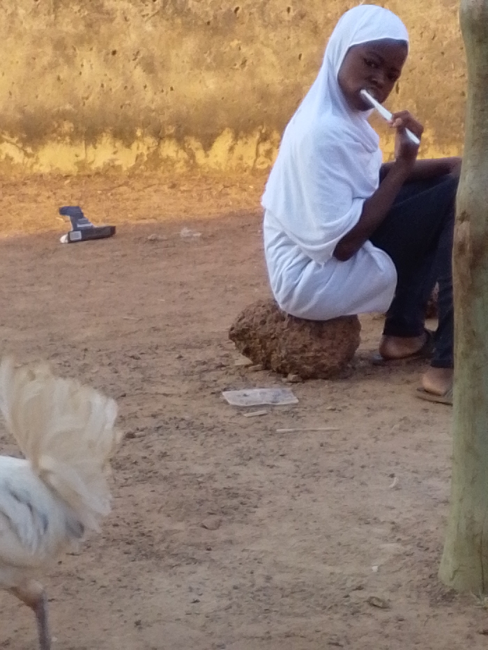 A young person wearing a white headscarf and top, and dark pants, is sitting on a brown rock. They are holding a toothbrush to their mouth. Another person's legs are visible to the right, wearing brown sandals. A white chicken stands in the foreground, its tail feathers fanned. In the background, a black object resembling a power tool sits on the ground in front of a rough, textured wall. The ground is dirt.