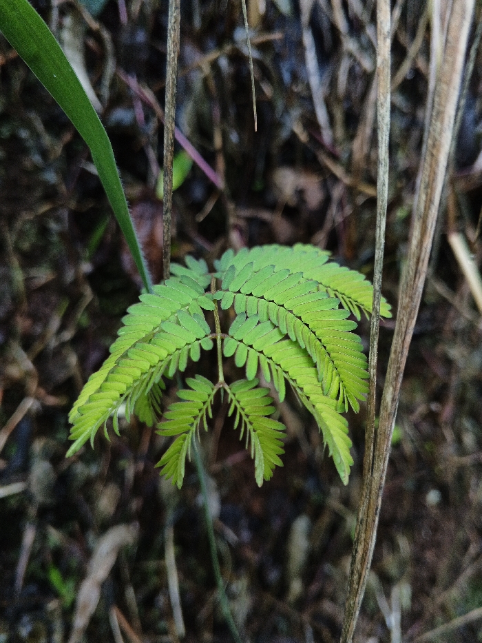 A vibrant green plant with numerous small, tightly packed leaves resembling a fern thrives amidst a backdrop of dry, brown foliage and thin stalks. The leaves are symmetrical, arranged in pairs along a central stem. A single, broader green leaf blade appears on the left. The overall setting is a natural, possibly overgrown area with muted colors accentuating the plant's bright hue.