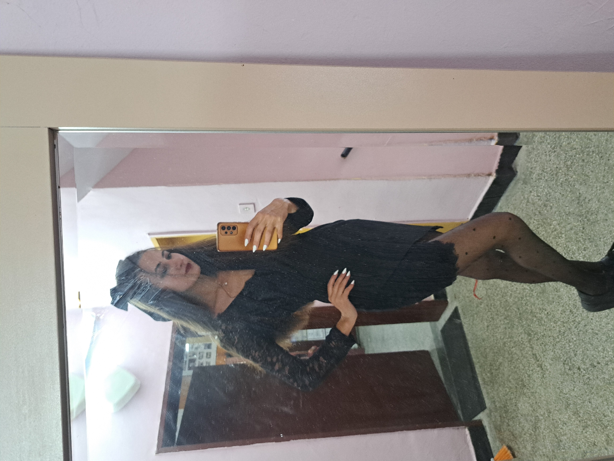 A woman with long dark hair, wearing a black dress with lace sleeves and dotted sheer tights, is taking a selfie in a mirror. She is holding a gold-colored smartphone with white nails visible. The reflection reveals parts of a room with pink walls and what appears to be a carpeted floor. Another mirror with a wooden frame is visible in the background. The city of Lokorsko, Bulgaria is not evident in this image.
