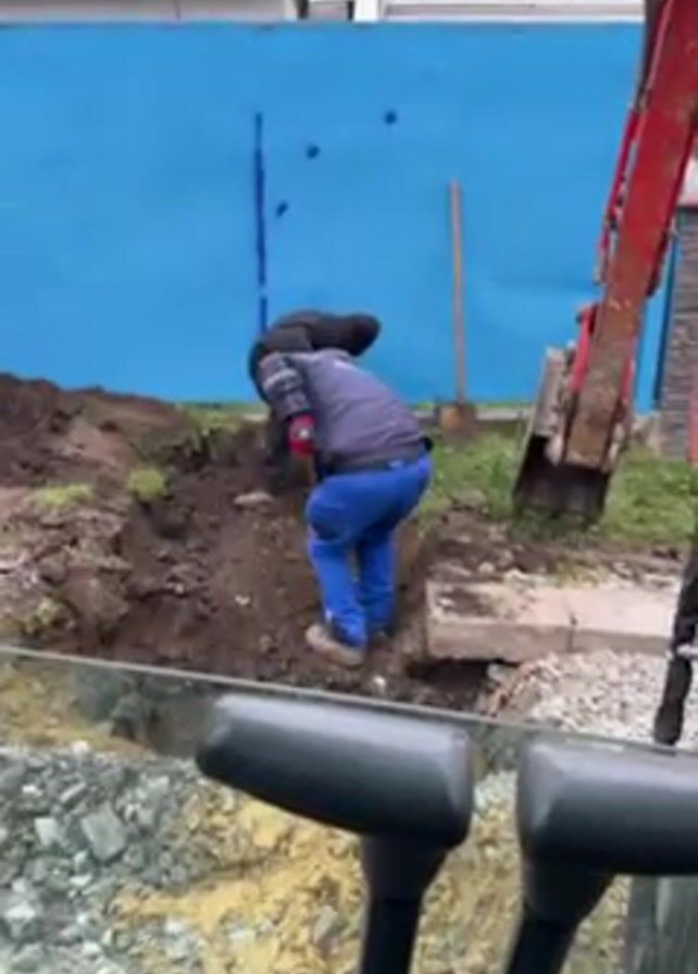 From the perspective of inside a vehicle, an individual is seen using a shovel to dig into the soil. The person is wearing a dark jacket, blue pants, and a black beanie. They are in a yard-like area, digging into a muddy patch next to a partially excavated trench. A red excavator is visible to the right. The background features a bright blue fence and a building with windows. Another shovel is lying on the ground next to the fence.