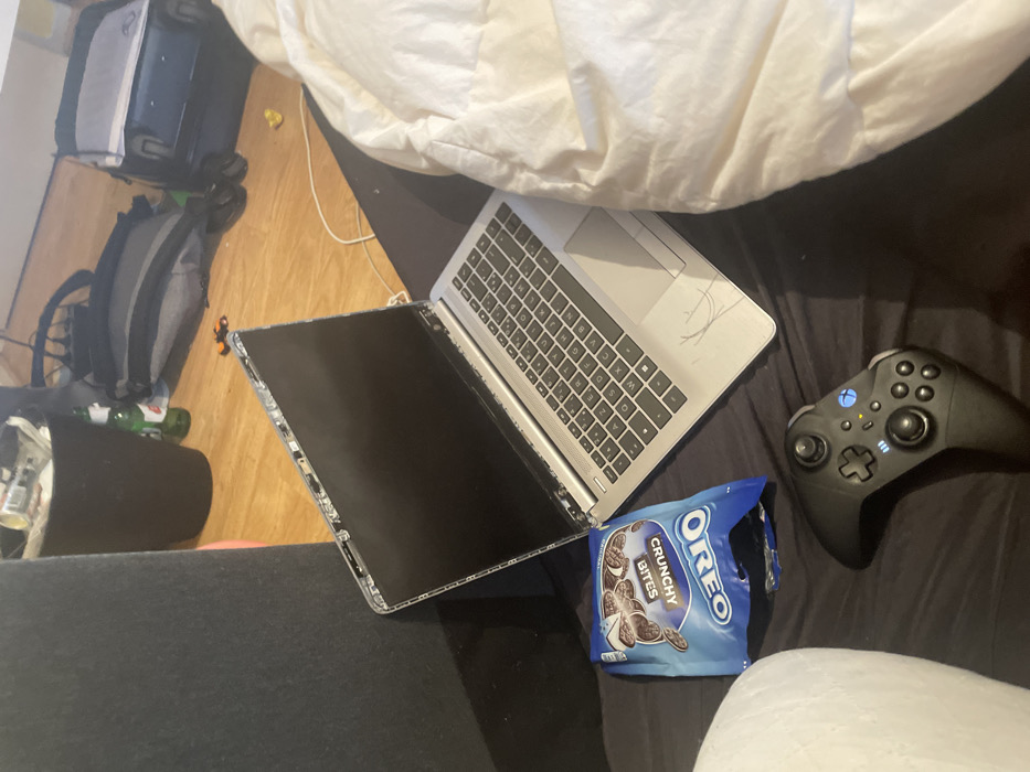 The scene depicts an interior room in Oberhausbergen, France, featuring a collection of personal items on a dark fabric surface and a wooden floor. In the foreground, a black Xbox-style gaming controller with an illuminated blue Xbox button rests. To its upper left, a partially open blue package of "OREO CRUNCHY BITES" cookies is visible. A silver laptop, positioned above these items, is open with a dark screen and a significantly damaged bezel, exposing internal components around its perimeter. The laptop's keyboard displays an AZERTY layout, and multiple scratches are present on the right palm rest. A crumpled white duvet occupies the right side of the frame. On the far left, a large, dark, rectangular object is partially visible. The background floor reveals a black waste bin containing various items, a green glass bottle, a grey and black backpack, a black rolling suitcase, white cables, a small orange toy, and a small yellow object.