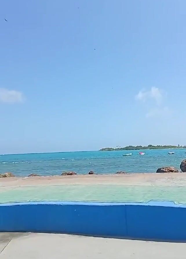 sunny day at the beach from what appears to be a slow-moving vehicle. The sea is visible in the background, and several small boats are on the water. A small island is visible on the horizon. In the foreground, a blue and green platform sits between the camera and the water's edge. There are some rocks lining the shore. As the vehicle continues forward, yellow streetlights come into view, and a palm tree is seen. The sky is blue with a few clouds.