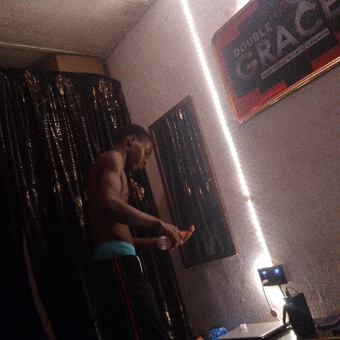 A shirtless man stands near a dark, draped wall. He wears dark pants with a thin red stripe and a light blue waistband. He holds a clear can and an orange item in his hands. Behind him hangs a dark framed mirror or painting. Above, a rectangular sign reads "Double Grace." A string of lights runs diagonally down the wall. A small electronic device with wires sits on a table in the lower right corner, next to a laptop and crumpled blue plastic.