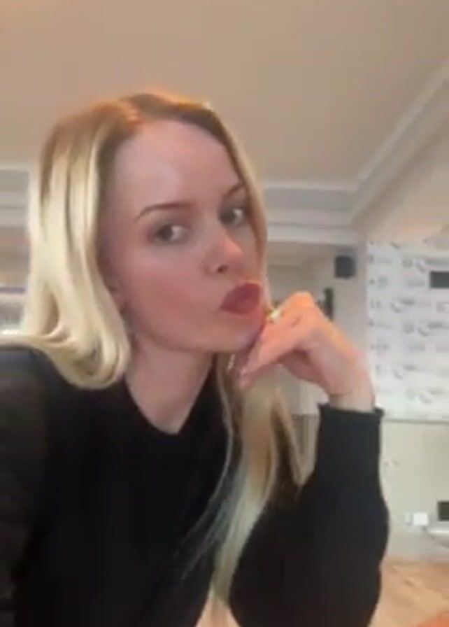 Two women with blond hair are sitting at a table. The woman closest to the camera is wearing a black top and has her chin resting on her hand. She is looking directly at the camera with a pouting expression. The other woman is wearing glasses and is looking down at a phone. The room has a decorative wallpaper pattern.