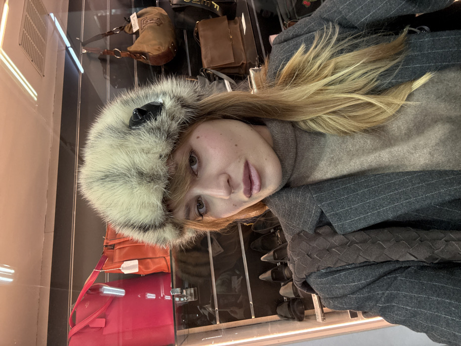 A female subject is depicted from the chest up in an indoor retail environment. She has fair skin, light brown hair with bangs, and brown eyes, looking directly at the camera with a neutral expression. She is wearing a light-colored fur hat with dark grey streaks and a small, dark, possibly plastic, embellishment on the right side. Her attire includes a grey pinstripe blazer over a light beige turtleneck sweater. A dark brown woven strap is visible over her left shoulder. The background features glass display shelves containing various handbags and shoes. On the left, a red tote bag and an orange-brown handbag, both with white price tags, are visible on an upper shelf. Below these, several dark-colored high-heeled shoes are displayed. On the right, a brown hobo bag with a dark strap and a visible emblem is hanging, with a rectangular brown leather bag positioned below it. The walls are dark, and reflections of overhead fluorescent lighting fixtures and an air vent are visible on the glass surfaces and ceiling. The specific location within Rome, Italy, cannot be identified from the visual information provided; however, it is an interior retail establishment.